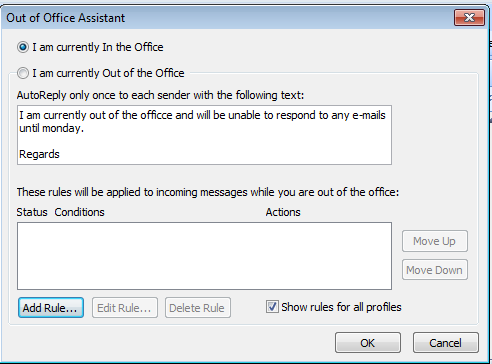 You can add rules so that the out of office system will run for a set number of days, to do this you must add a new rule. To do this click on Add Rule…
