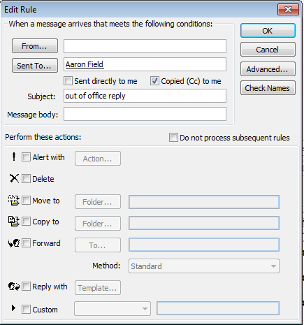 From this window you can add the rules to your out of office system. to select how long out of office is active for you can click advanced button then the next windows appears. From here you can tick the box that says from and to and select the dates that you want out of office to run from. Then click OK to save the settings.